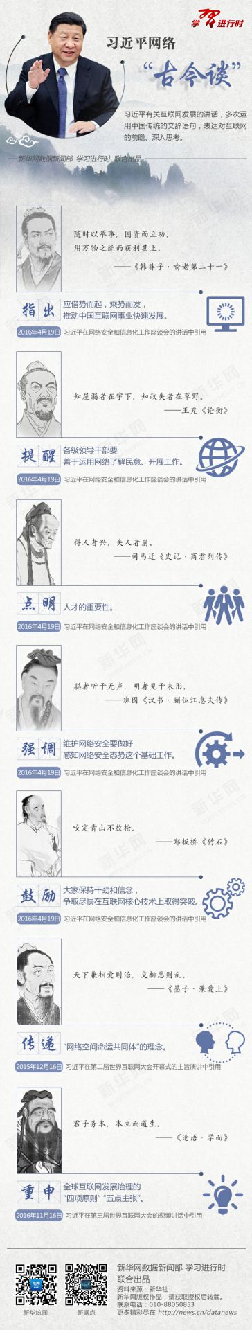 学习进行时】习近平总书记博古通今,古籍中的名言警句,常常信手拈来,或巧妙化用,或引申阐发,用以指导当前的工作。新华社《学习进行时》原创品牌栏目“讲习所”今天推出文章,与您一起品味总书记借古老的文辞,巧妙表达对互联网发展的深切思考。